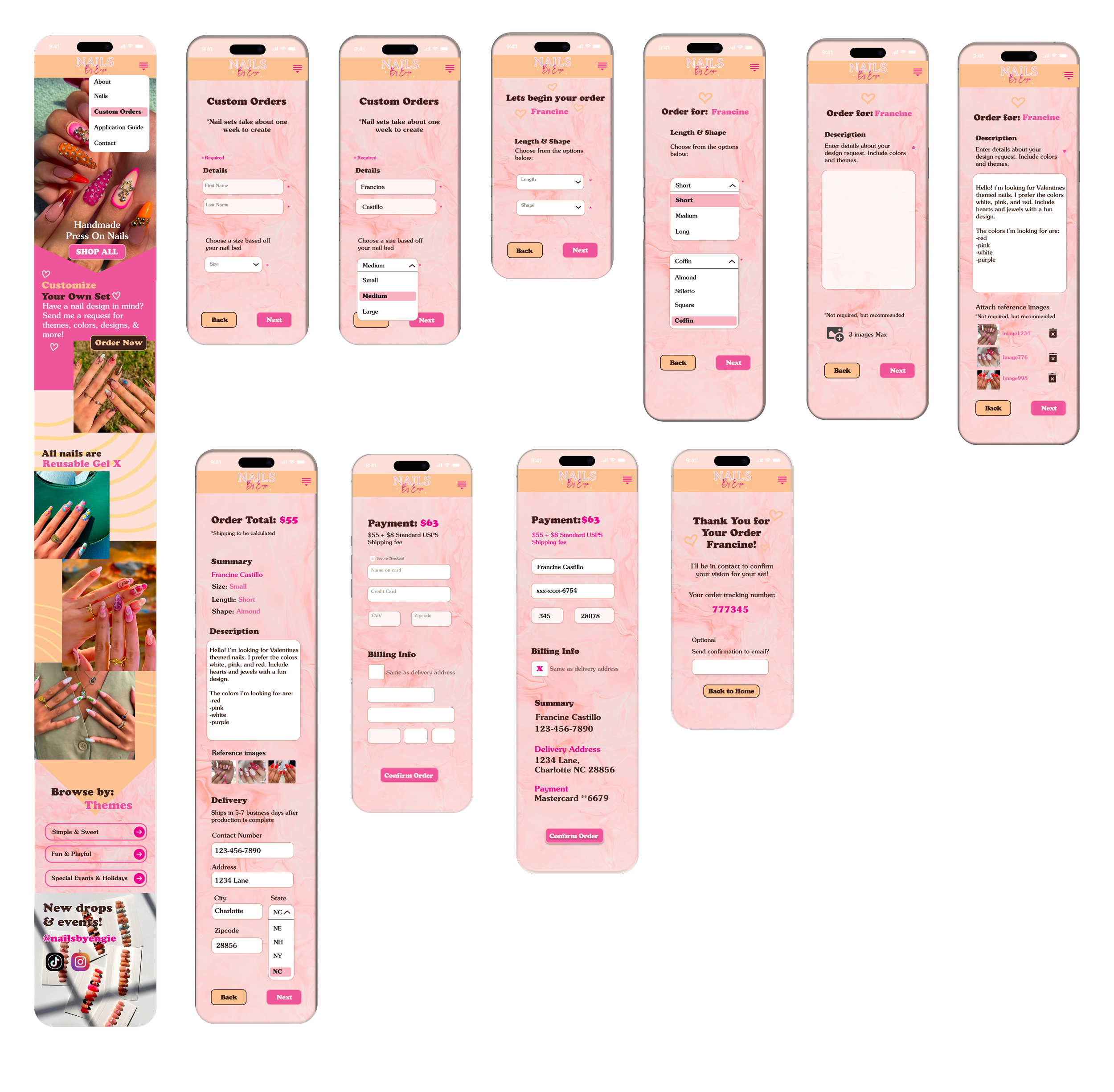 Combining the low-fidelity flows and branding, the final wireframes came together. During this process, more flows were developed as I thought about what the user would look for when trying to gain trust with a new nail service.