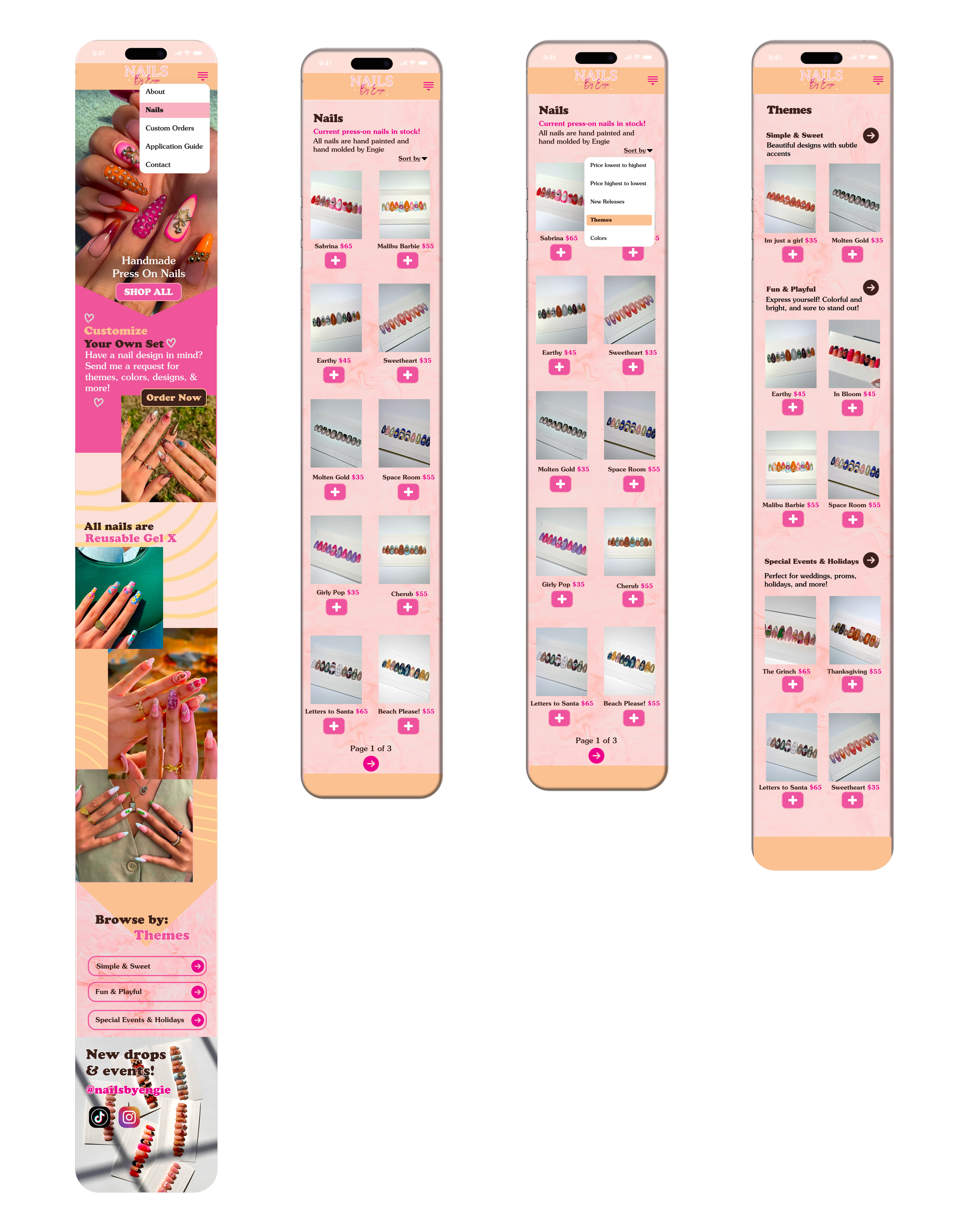 Starting from the navigation on the top right corner, users can easily browse through pages of available nail sets in stock. Users can sort the nails by price, new releases, themes, and colors. This provides organization, an easier search, and a way for users not to get overwhelmed by the amount of products offered.