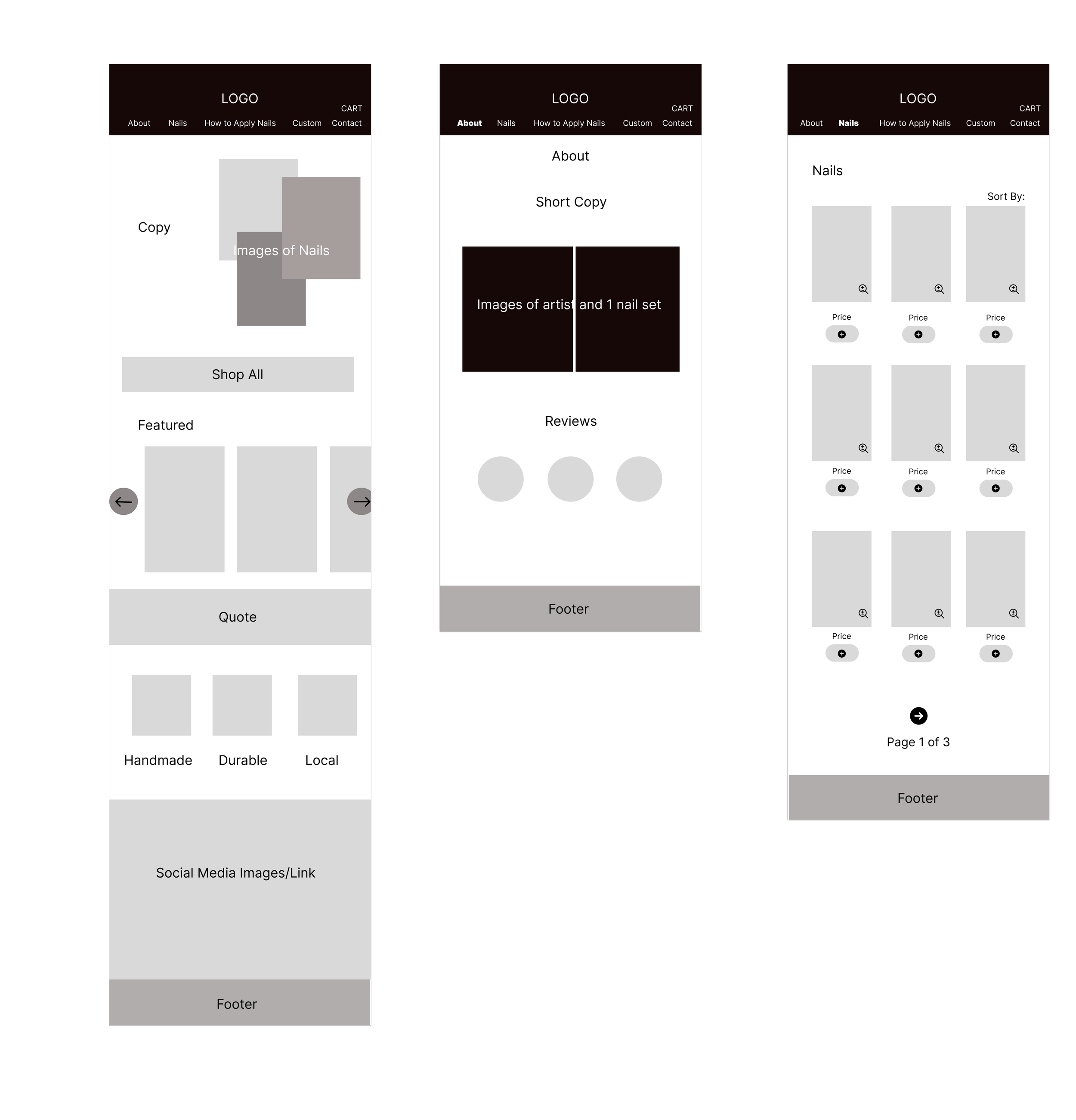 These wireframes showcase what the home page, about page, and current nails in stock would appear.